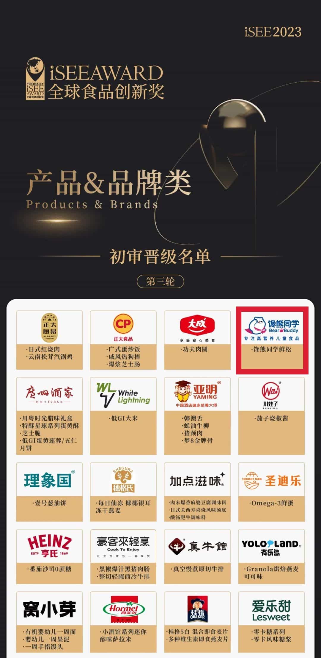 本月,食品行業備受認可且規模最大的綜合獎項iSEE AWARD公布評選復審結果。獎項共設立【iSEE全球食品創新獎】與【iSEE全球美味獎】兩大獎項,超過900個品牌參與評選。其中佳沃食品旗下高營養兒童食品品牌饞熊同學鮮松產品成功進入ISEE全球食品創新獎復賽圈。