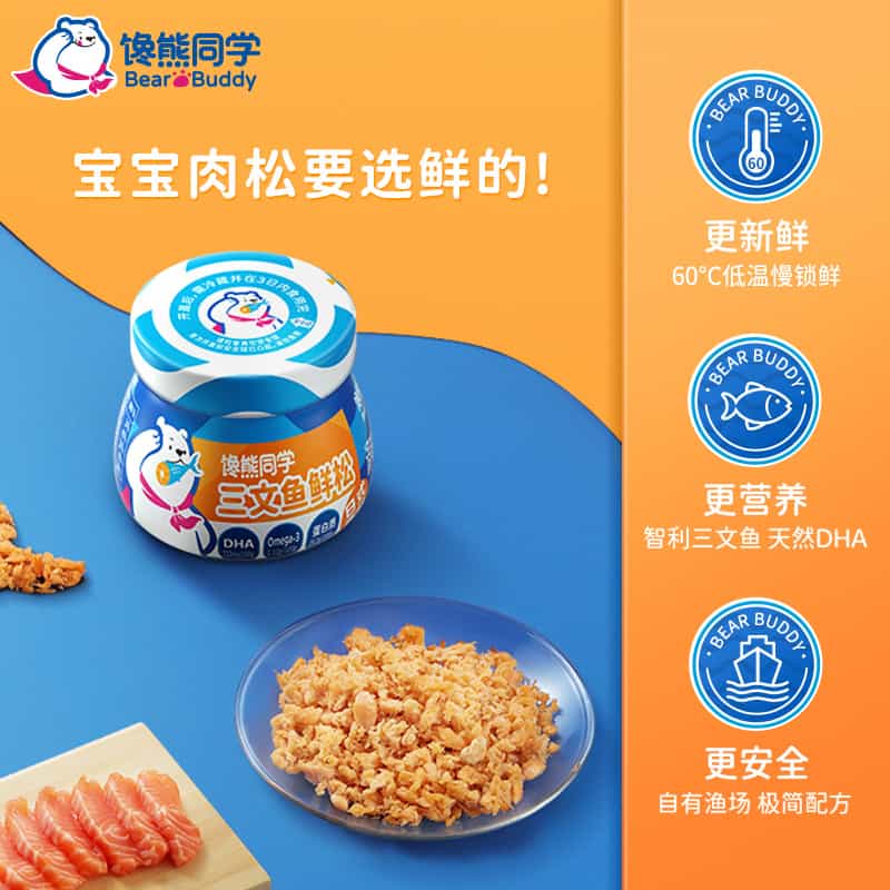 饞熊同學鮮松產品精選優質三文魚/真鱈魚原料,采用60°低溫慢煮工藝,口感鮮香軟嫩;含有豐富的DHA,歐米伽3多不飽和脂肪酸和蛋白質等多種營養物質,對兒童的腦力、視力神經發育至關重要。去年雙十一活動中,饞熊的鮮松在淘寶寶寶輔食/魚松/肉松品類下全部品牌中排名15。