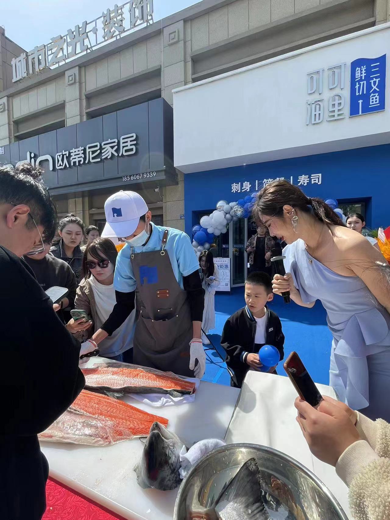 即墨店開店首日,廚師現(xiàn)場切割冰鮮三文魚