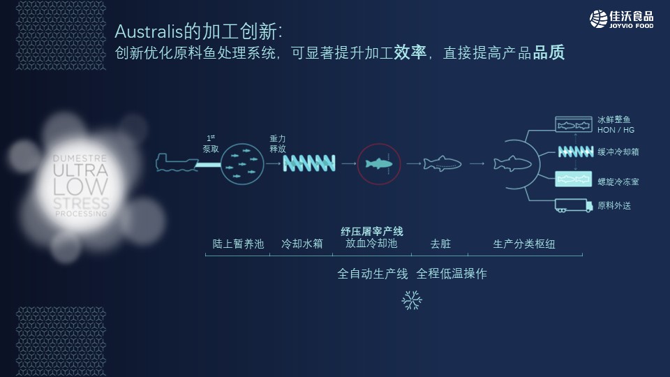 近年來,伴隨著生態環境的變化,越來越多的人開始關注動物福利和可持續發展。佳沃食品智利子公司Australis,一直專注于三文魚的養殖和加工。Australis的超紓壓暫養屠宰初加工系統,通過減少初級加工中的壓力,尊重生命價值,在供應高質量三文魚產品的同時,還關注保護動物福利,為消費者提供健康、環保的選擇。